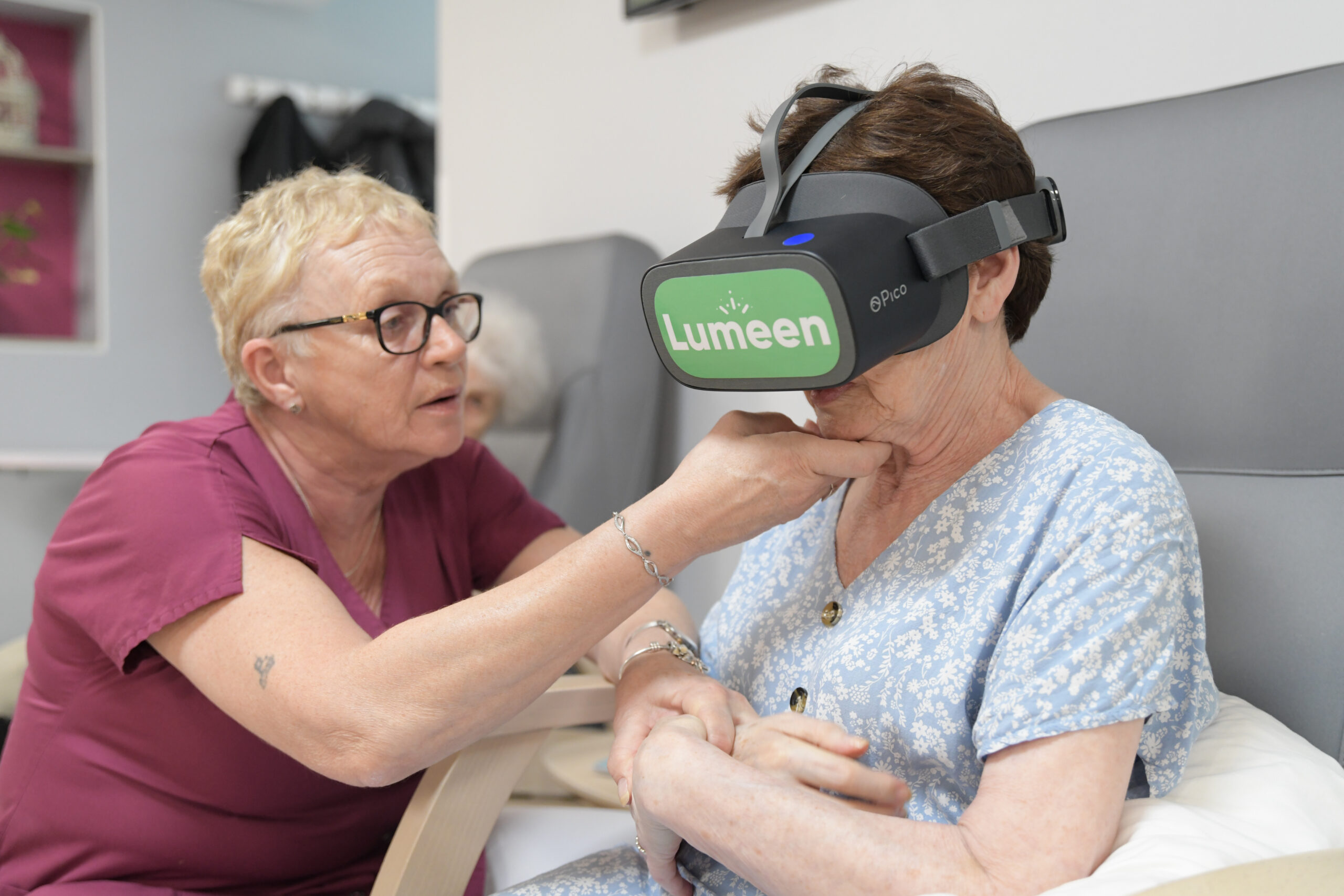Des casques de réalité virtuelle Lumeen sont proposés aux résidents, ils permettent de s’immerger à 360° dans différents environnements, tels que sous l’eau, au bord d’une falaise ou à la mer. De la musique, des bruits ou des voix peuvent également être écoutés pour une expérience immersive complète.